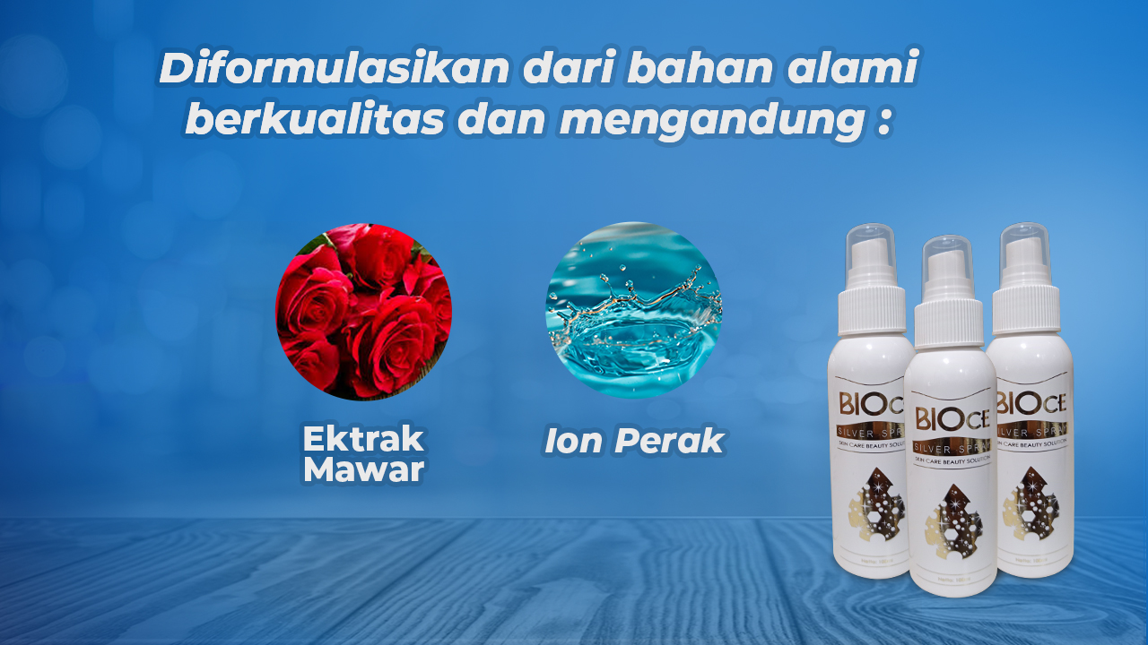 Bioce Silver Adalah Air Ionic Perak Murni. Mengandung Vtamin E, Provitamin B5 / D-Phantenol, Vitamin C dan Ektrak Kelopak Bunga Mawar.